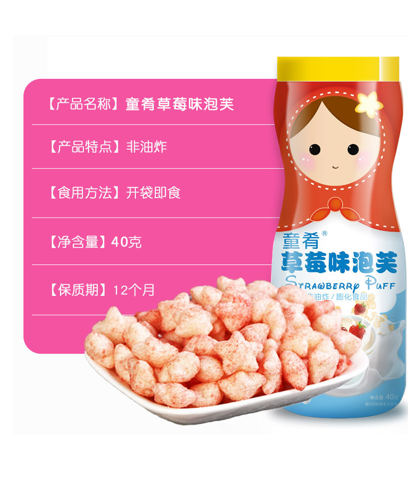 童肴泡芙采用先进的膨化技术,原理是在极短的时间内通过挤压使食品中的水分汽化,并产生很多小孔。表面蓬松多孔,口感酥脆,更容易消化。