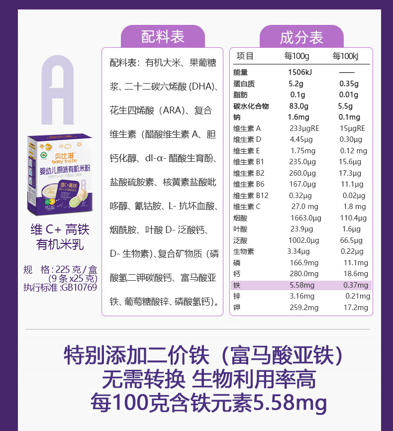 贝比滋婴幼儿高配有机米粉富含12种维生素和5种矿物质,除了常规的钙、磷、铁、碘、锌外还加入了维生素A、D、E、维C、B族维生素等,让您的宝宝每天活力满满!